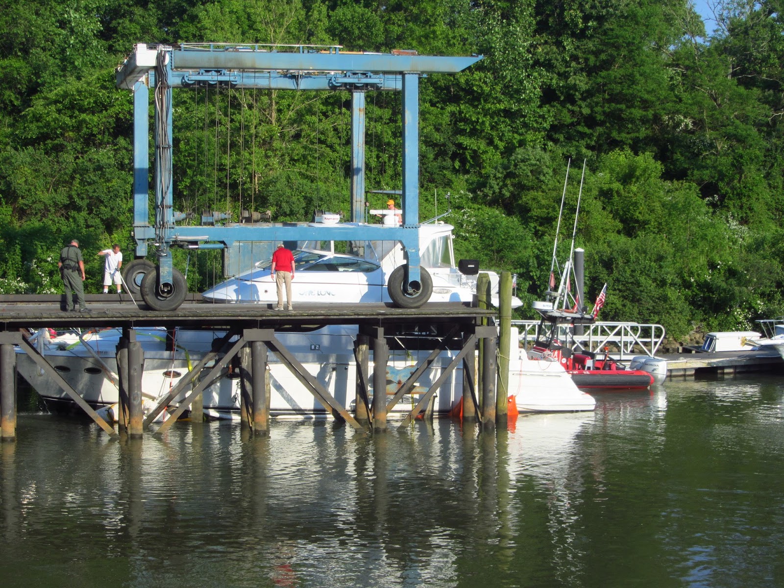 The next day we saw the same boat being towed by BoatUS into the marina where we were staying. It had flotation bags all around it to keep it from sinking, and four gasoline water pumps pumping out the water that was coming into the boat. It was being towed and pushed by two tow boats. They maneuvered it into the slings of a travel lift and it was lifted from the water. I could not see the actual damage, but could see water pouring out of the bottom of the hull near the middle of the boat.